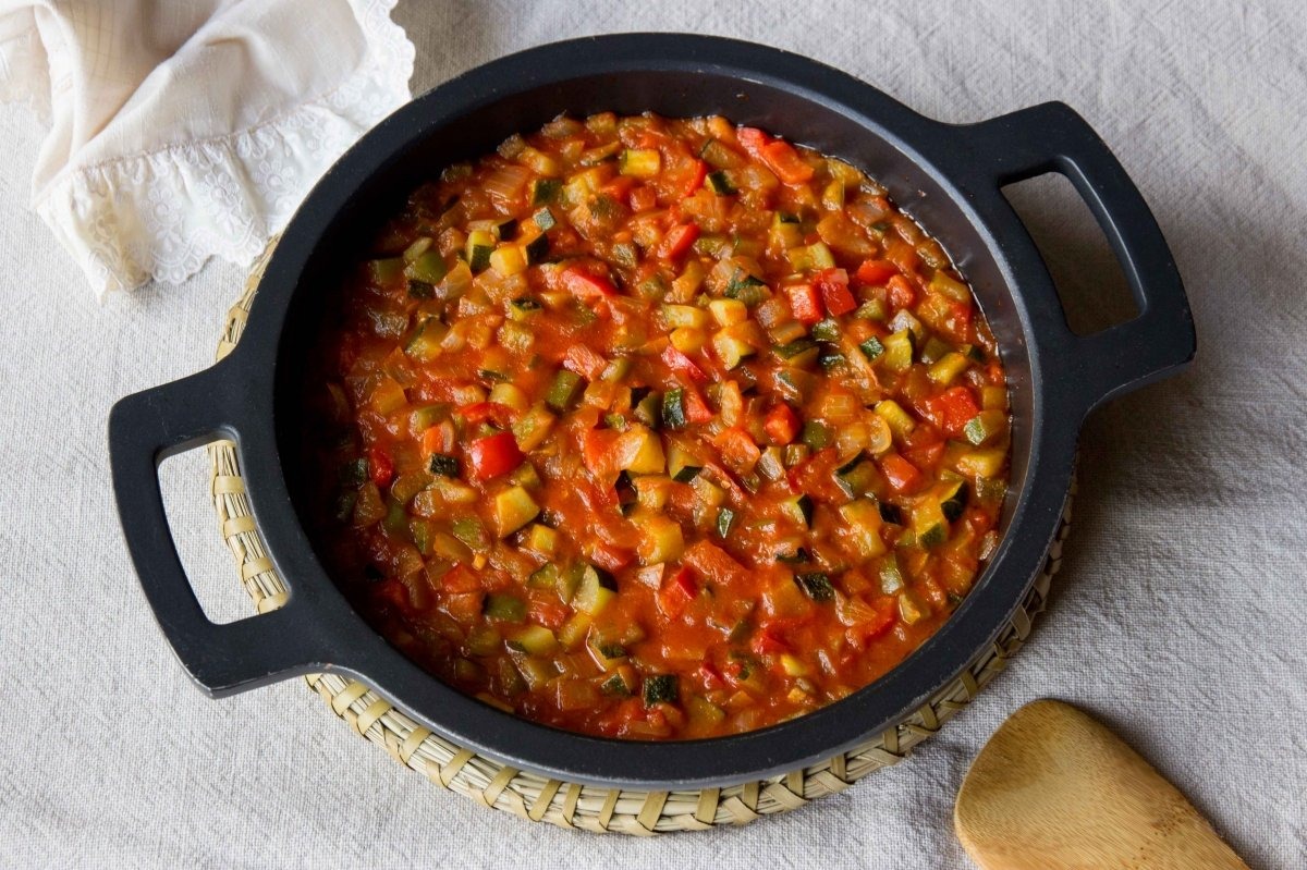 Guiso de verduras con tomate, pimientos y calabacín.